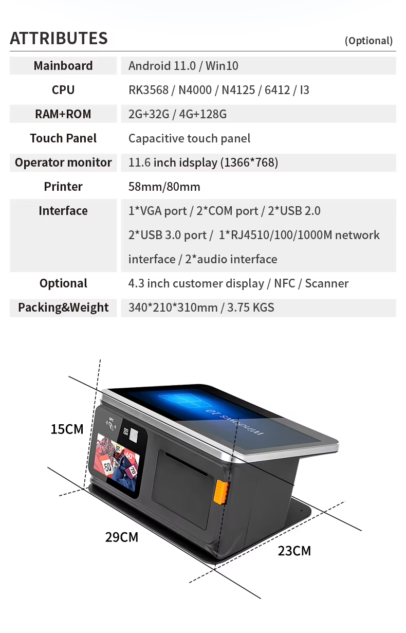 11.6″ all-in-one pos with 80mm thermal printer and barcode scanner